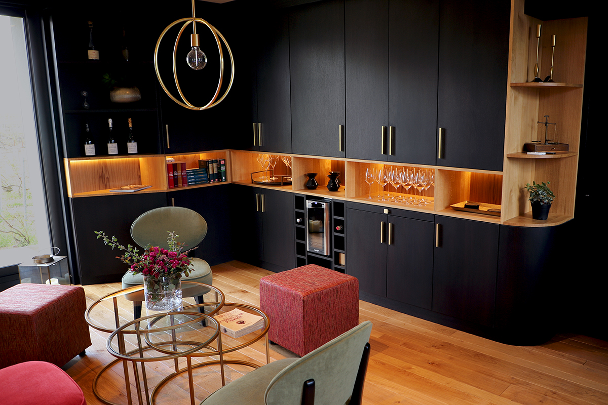 Salle de dégustation en chêne et panneaux stratifiés