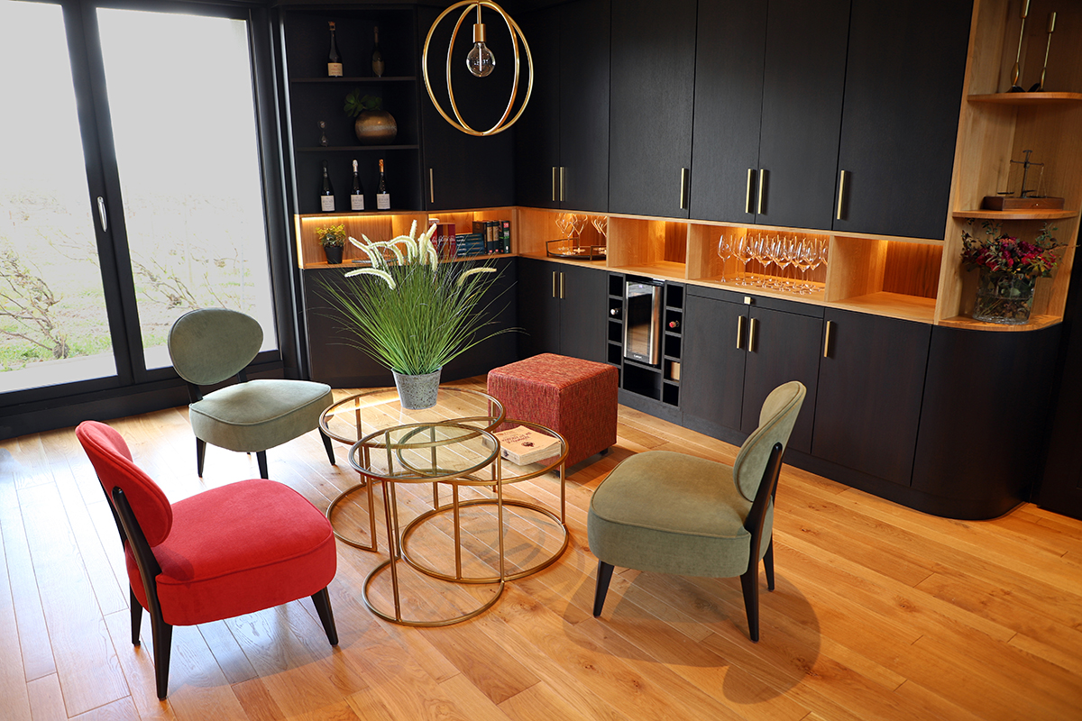 Salle de dégustation en chêne et panneaux stratifiés