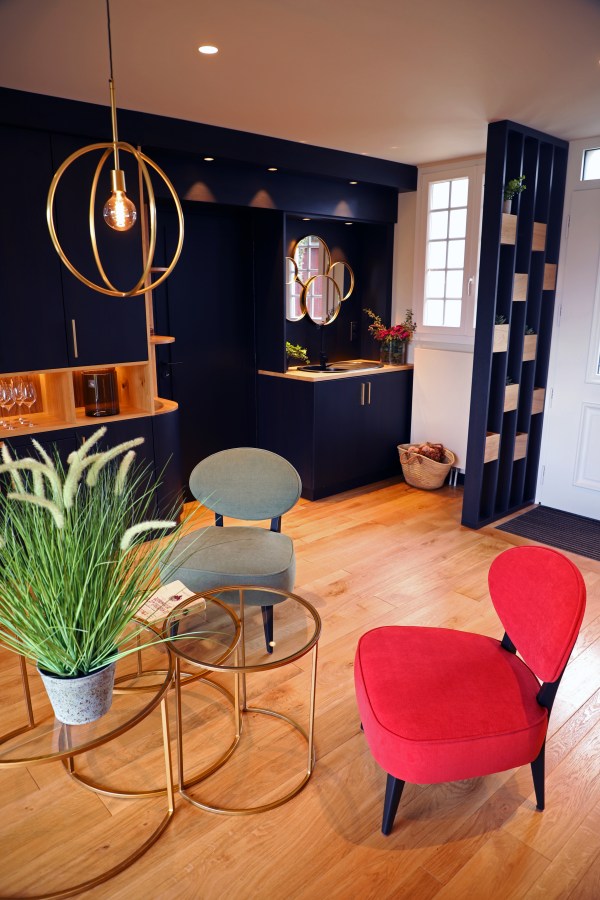 Salle de dégustation en chêne et panneaux stratifiés