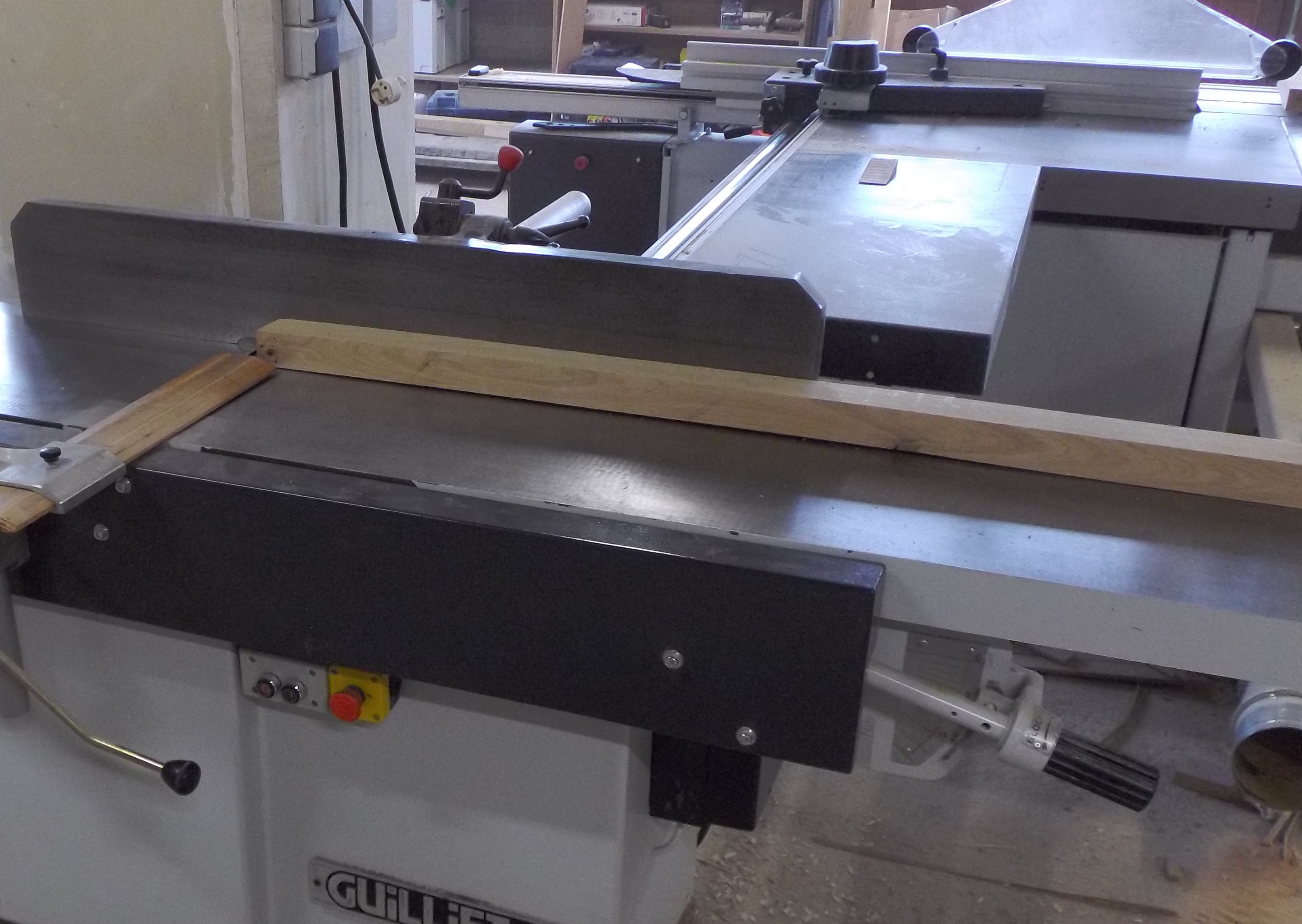 Deux passes sont donc nécessaires pour chaque morceau (chant et plat) mais la finition étant meilleure qu’à la dégauchisseuse, on passe fréquemment les 4 faces afin d’avoir des bois plus propres.